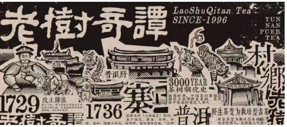 然而, 1946 年一场大火焚尽家业, 陈家商号就此沉寂于历史尘埃之中。但茶的记忆并未断绝,火塘边的故事仍在代代相传。陈胜帮在成长过程中,虽未亲历祖辈的辉煌,却从叔伯长辈口中听闻无数关于茶山、马帮与商道的传奇。这些故事如涓涓细流,潜移默化地塑造了他对普洱茶的情感认同。直至 2016 年,当他决定将多年收藏与思考凝练为一个品牌时,“老树奇谭”应运而生。“老树”强调产品以百年古树茶为核心原料,彰显稀缺性与时间价值;“奇谭”则承载家族与茶山的传奇叙事,延续“陈家商号”的文化基因。在他看来,“老树奇谭”不是横空出世的新品牌,而是对百年商号精神的当代复兴,是一次跨越时空的郑重接续。
