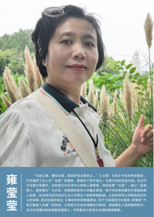 甘为孺子育英才,克勤尽力细心裁。从教育初心到文化使命,雍莹莹将自己定义为一名“传播传统文化的教育企业家”,以北辰般的坚定与执着,在传统文化教育领域默默耕耘。她用“品典育人”的创新方法,让经典智慧落地生根;用“启明心境”的教育理念,让文化传承薪火相传;用“千教万教教人求真”的赤诚,让国学复兴深入人心。展望未来,在这条任重道远的道路上,她将继续笃行不怠,以匠心雕琢思想,以文化浸润心灵,擎擎画文化复兴的壮丽篇章!
