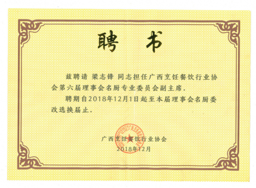 作为梁志锋中国烹饪大师工作室领办人、国家职业技能鉴定考评员,梁志锋不仅专注个人技艺精进,更致力于行业传承。他将工作室打造成一个开放的平台,不仅亲自传授青年厨师精湛技艺,更将星级酒店的管理经验、赛事锤炼的心得、以及融合创新的思维方法倾囊相授;他担任国家职业技能鉴定考评员,积极参与广西烹饪协会名厨委员会等工作,将个人的标准上升为行业人才培养的公共标准。他的目标,是“点亮一盏灯,照亮一群人”,让广西餐饮的后继力量能站在更高的起点上。