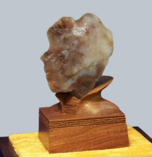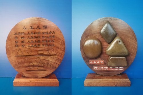 广西来宾大湾石那方方正正的几何造型,曾让李振勇如获至宝,也让他陷入深思:无文释读,石之韵致何存?日夜苦思间,灵感如清泉突涌。他将象征“圆满善终”的圆形置侧,以“形基稳定”的梯形为底承托坚稳,用“多棱多角”的三角形作灵活上身,取“变化多端”的菱形为智慧头颅。刹那间,几块零散的石头竟化作一位身着汉服的追道者,在无声中演绎着对人生圆满的求索。这份巧思,早已超越玩石的范畴,是“格物致知”的生动实践。