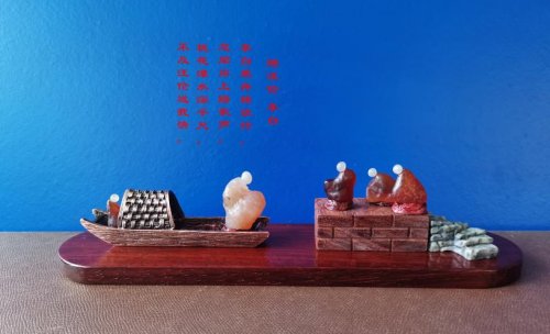 李振勇先生的石之妙想,更在组合间绽放光华。戈壁玛瑙与九龙壁石相合,便成《蛤蟆、天鹅》,配上“癞蛤蟆想吃天鹅肉”的俗谚,谐趣中藏着对梦想的戏谑与尊重;数枚小石精心排布,《赠汪伦》的踏歌情深、《将进酒》的豪迈洒脱便跃然眼前,让人在石间读懂“诗中有画,画中有诗”的境界。他更化身“石上厨神”,用戈壁玛瑙塑“孜然白切肉”,以鲁山肉石做“肉皮冻”,红皮玛瑙珠凝“官保鸡丁”,古磬石拟“蒸鲍鱼”,一百多道“石头美食”栩栩如生,观之仿佛能闻佳肴香气,尽显“化腐朽为神奇”的匠心。