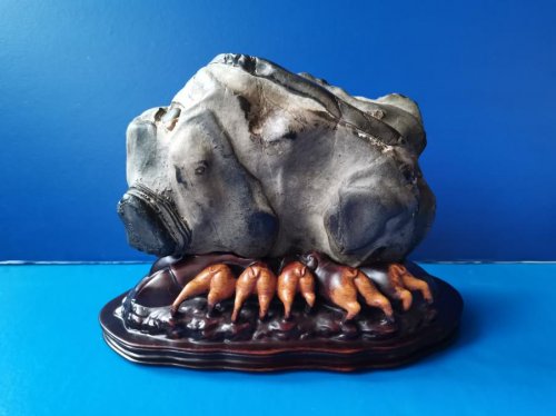 奇石有价,配座无心则失色。李振勇不仅善赏石,更工造座,亲手为每块奇石量身定制底座。藏拙补缺,扬优避劣,让底座成为奇石的最佳注脚,愈发烘托出主题的深邃。这份细致,恰如他的为人——身为大海之子,他直率仗义,厚道诚恳。赏石品石中,他净化心灵,提升素养;藏石交友时,他发掘培育后辈爱好者,以石为媒,广结善缘。