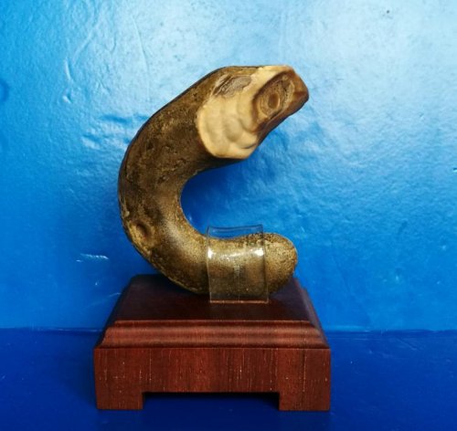 给奇石命名,在李振勇这里是一场与自然的对话,而非简单的形似附会。他从不将形似老者的石头草率呼为“王母”,也不把状如灵龟的奇石轻唤作“神龟”。石种的肌理、产地的风土、外形的韵致、内涵的深意,都需在他的品鉴中一一沉淀,最终凝结成画龙点睛的名号。一块九龙壁石如海上孤礁,他便冠以《钓鱼礁》之名,缀以“姜太公钓鱼——愿者上钩”的典故,让静石有了渔樵江渚的悠然;一枚沙漠漆石圆若人头,表面天然晕染出哭笑交织的纹理,他命名《苦笑人生》,配之“凿壁偷光”的励志故事,让顽石承载了人生的辩证与坚守。这般附意,恰似“羚羊挂角,无迹可求”,让静态的石头跃动起生命的温度。