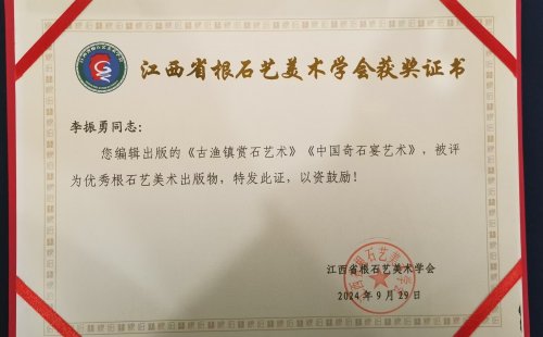 李振勇的赏石之路,始终贯穿着“以文载道”的坚守。他笔耕不辍,将半生赏石感悟凝结为字字珠玑,《赏石也要功夫硬》《小品组合石创作感想》《观赏石命题心得》等佳作相继刊载于《中国国土资源报》《中华奇石》等权威平台,被《中国剪报》及各大主流网站广泛转载,让原本小众的赏石文化突破圈层壁垒,走进更多爱好者的视野。更值得称道的是《中国奇石宴艺术》《古渔镇赏石艺术》两部专著获得江西省优秀根石艺美术出版物。《古渔镇赏石艺术》这本双语专著以彩照配文的形式,别具情趣意蕴,内容聚焦李振勇多年收藏的珍品,涵盖造型石、图纹石、筋脉石、玛瑙彩珠、矿物晶体、古生物化石、陨石等各类观赏石,精选近110件藏品悉心呈现。他依据每件石品的独特风貌,赋予其丰沛的文化内涵——或援引典故诗词,或演绎生动故事,让全书集知识性、观赏性、趣味性于一体。