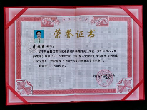 手中藏石,眼中有魂,李振勇的收藏与鉴评实力在业界有口皆碑。他秉持“藏石先藏心”的理念,淘选的奇石在各类赛事中屡获殊荣:2009年摘得中国精品奇石大赛“十佳玛瑙石奖”;在无锡国际观赏石精品展、上海“万春杯”全国小品石展中两度斩获银奖,其中作品《海燕》《蓄精养锐》荣获“国石杯”2019中国观赏石网络博览会金奖;《中华句龙》荣获“国石杯”2020中国观赏石网络博览会金奖,更成功跻身“中国精品奇石100强”“中华奇石500强”之列。这些荣誉的背后,是他硬核资质的坚实支撑——中国观赏石一级鉴评师、国家发改委首批注册观赏石价格评估师、江西省根石艺美术大师,深厚的专业功底让他的每一次鉴评都掷地有声。李振勇始终将文化学习和实地考察结合一起,参加观赏石鉴评师培训班、观赏石价格评估师培训班,赏石传承人研修班,矿晶培训班、观赏石高级研修班学习。走遍全国每个省,到内蒙古、西藏无人区等等奇石产地考察课程,让赏石技艺与文化精神在薪火相传中生生不息。2019年,象山县博物馆举办的“李振勇赏石艺术展”历时两月,让万千观众得以近距离感受奇石之美与文化之韵。