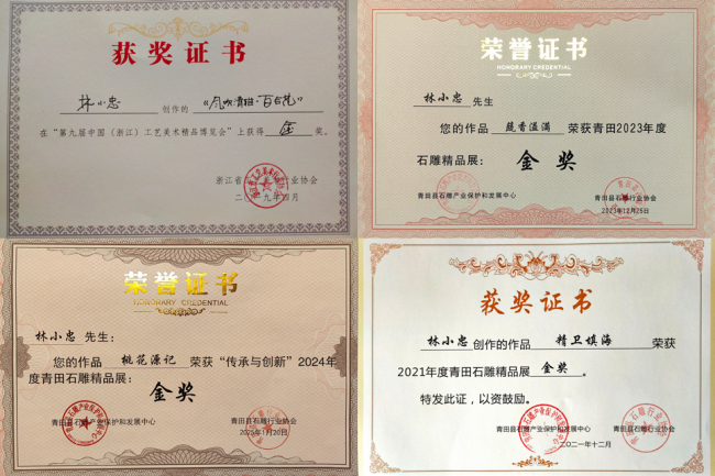 【附录】林小忠部分荣誉:?2011年,参加首届藏一楼杯石雕技艺大比武,荣获二等奖;?2012年,作品《笑口常开》在非遗薪传——浙江石雕精品展上荣获——铜奖;?2012年,参加第二届青田石雕技艺大比武荣获—— 一等奖;?2017年,作品周村石《春》在第十三届中国(深圳)国际文化产业博览交易会冬季工艺美术精品展上,荣获“中国工艺美术文化创意奖”——银奖;?2019年,作品《风吹清雅·百合花》在第九届中国(浙江)工艺美术精品博览会上荣获——金奖;?2021年作品《守望》在“赏清石,忆党史,守初心”青田石雕作品展上荣获——银奖;?2021年,作品《精卫填海》则在二〇二一年度青田石雕精品展上荣获——金奖;?2022年,作品《生命·力量》在第十届中国(浙江)工艺美术精品博览会上荣获——铜奖;
