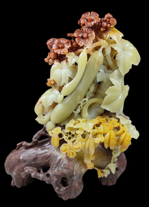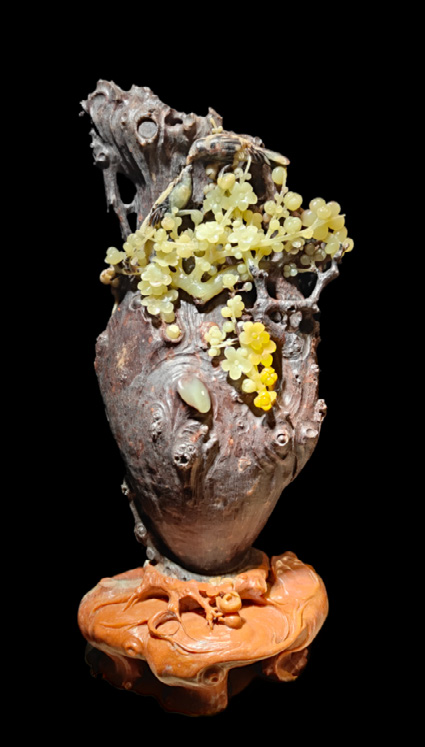 创作中,林老师运用了“三色分层雕刻法”,将石料的本色、俏色与石皮巧妙融合:近景刻画苍劲的梅枝,以高浮雕技法展现树皮的皴裂纹理,每一道沟壑都暗藏力道;中景用镂空雕呈现半开的梅朵,花瓣的薄透感通过刀刃的轻重变化来实现,仿佛能嗅到暗香浮动;远景则保留石料的天然肌理,留白处似云雾缭绕,给观者留出想象空间。整件作品没有过多装饰,却在方寸之间呈现出“枯木逢春”的生命力,这也是他想通过作品传递的——传统工艺如古梅,唯有守正创新,才能永葆生机。?