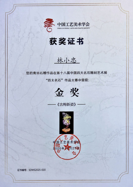 “公益不是一时的举动,而是一生的坚守。”林小忠常说,青田石雕的“石魂”是温润包容,匠人的“匠心”是仁爱向善,作为青田石雕的传承者,不仅要创作出有温度、有灵魂的作品,更要做有爱心、有担当的匠人。他希望通过自己的公益善举,带动更多青田石雕从业者参与到公益事业中来,让“以石传爱”成为青田石雕行业的新风尚,让每一件石雕作品都不仅承载着艺术之美,更传递着人间大爱。“当石雕的温润与慈善的温暖相遇,便能绽放出最动人的光芒,这也是我对‘石魂与人文共生’理念的最好践行。”未来展望:让石韵梅香飘向更远? 斩获2025年“四大名石”金奖后,林小忠也为后续创作定下了新方向,他计划创作“四季清芬”系列作品,以梅、兰、竹、菊为创作核心,甄选四种不同质地的青田石,以石为媒诠释“四君子”的高洁品格。目前该系列的《古梅新姿》已完成创作,接下来他将潜心投入《幽兰吐芳》的雕琢。创作中,他会延续独有的“三色分层雕刻法”,同时大胆尝试更多现代构图思路,让传统题材在匠心雕琢下焕发全新的艺术魅力??