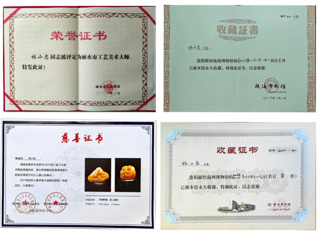 “石雕不仅是艺术,更是传递温暖的载体;匠人不仅要守匠心,更要担责任。”深耕青田石雕三十载,林小忠始终将公益慈善融入创作与生活,以石为媒、以爱为桥,通过慈善拍卖、作品捐赠等方式,将石雕艺术的价值转化为公益力量,用实际行动践行着匠人的社会责任,让青田石雕的艺术之美与慈善之爱相互交融,温暖着更多人。